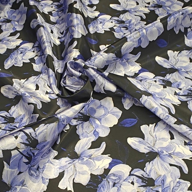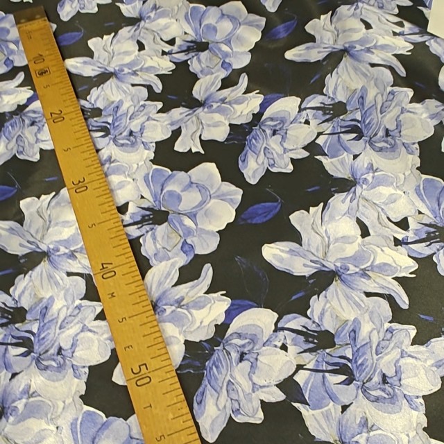 - Атлас с блеском Кристалл с акварельными розами цвета индиго для пошива нарядных платьев